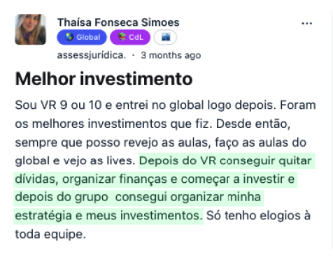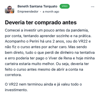 Uma das coisas que fazem do Viver de Renda um curso com uma nota de satisfação tão alta é que, por ter as suas dúvidas respondidas por um especialista no assunto em até 24h, o aluno acaba com um aproveitamento muito melhor.